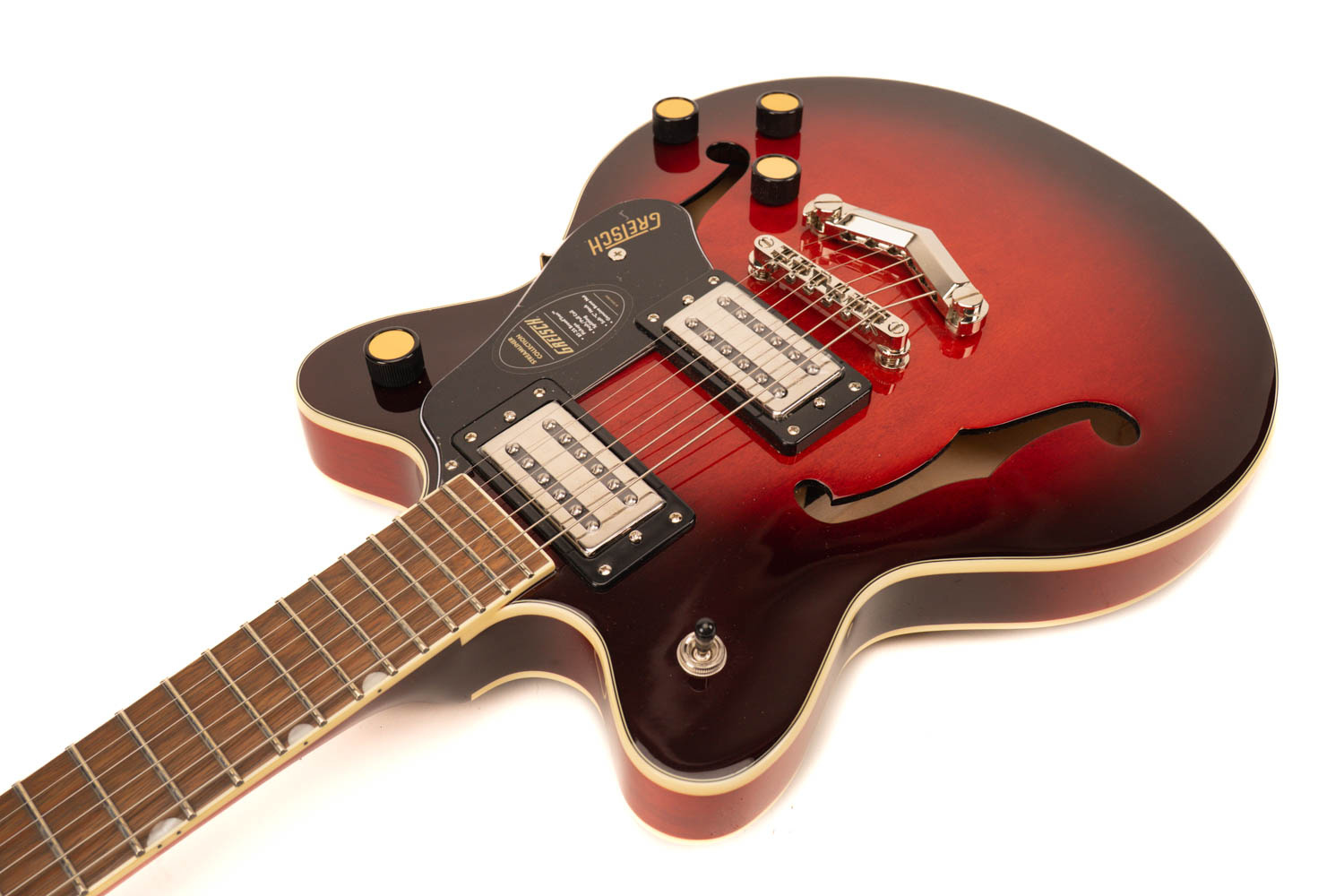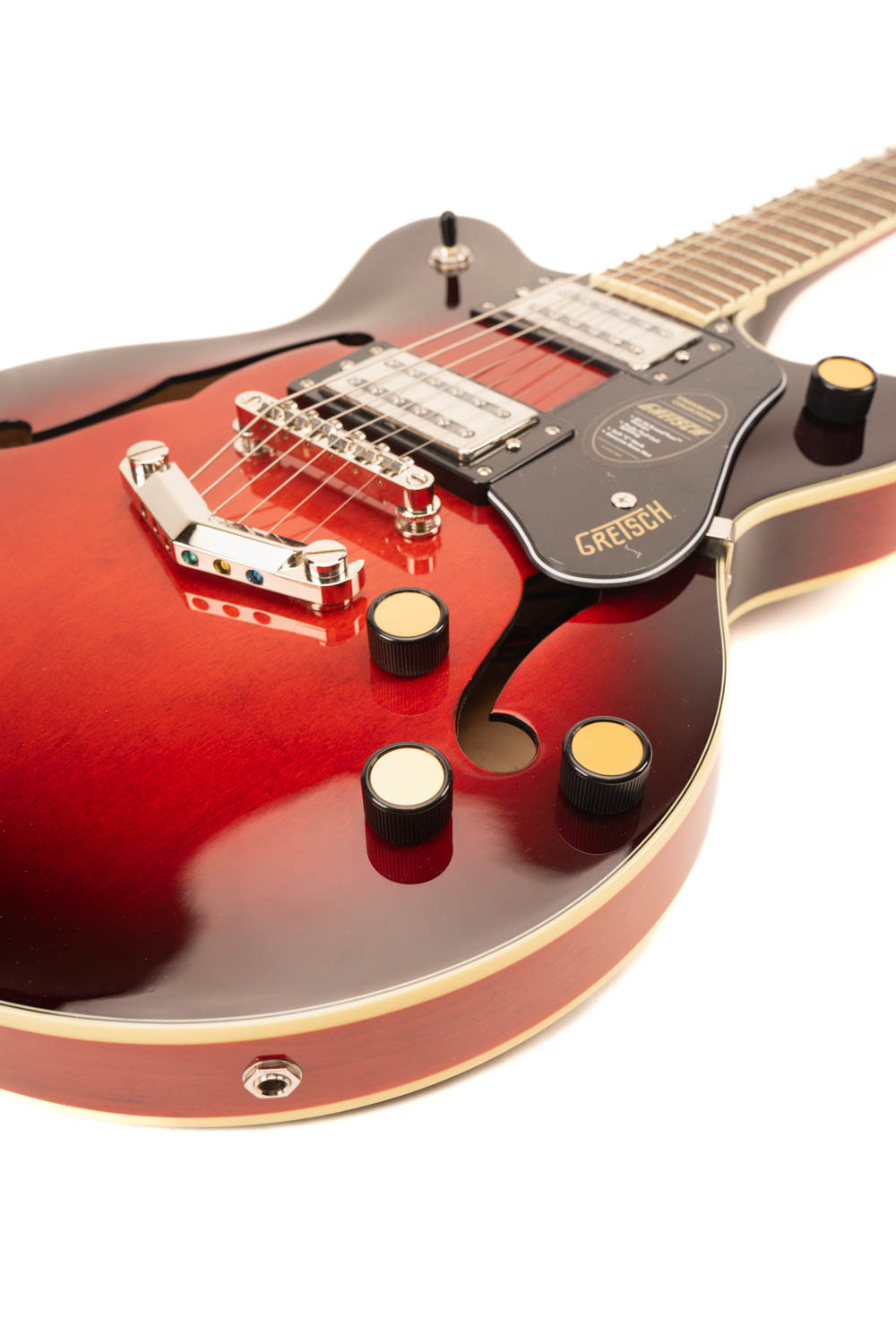 Hals en toets: De nato hals met set-neck constructie biedt een comfortabele bespeelbaarheid, met een Soft "C" profiel dat goed in de hand ligt. De laurier toets heeft een 12-inch radius, 22 medium jumbo frets en thumbnail inlays, wat zorgt voor een soepele speelervaring en een klassieke Gretsch-look.