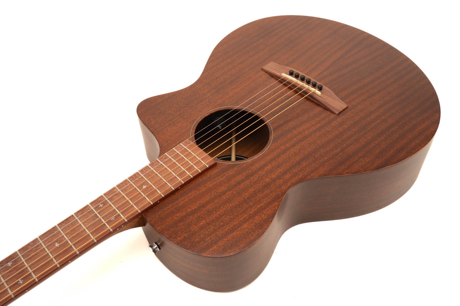 Het massieve sapele bovenblad, gecombineerd met sapele zij‑ en achterkant, levert een heldere, open klank met een warme middenfocus en een strakke respons. Sapele staat bekend om zijn balans: iets sprankelender dan mahonie, maar met dezelfde warmte en controle. Hierdoor voelt de SC‑10E zich net zo thuis bij subtiele fingerstyle als bij ritmisch strummen.
