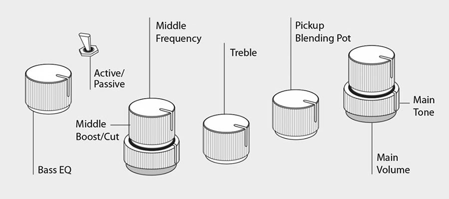 | controls | volume / tone (dual pot) pickup blender treble middle / middle frequency (dual pot) bass mini toggle (active / passive) |