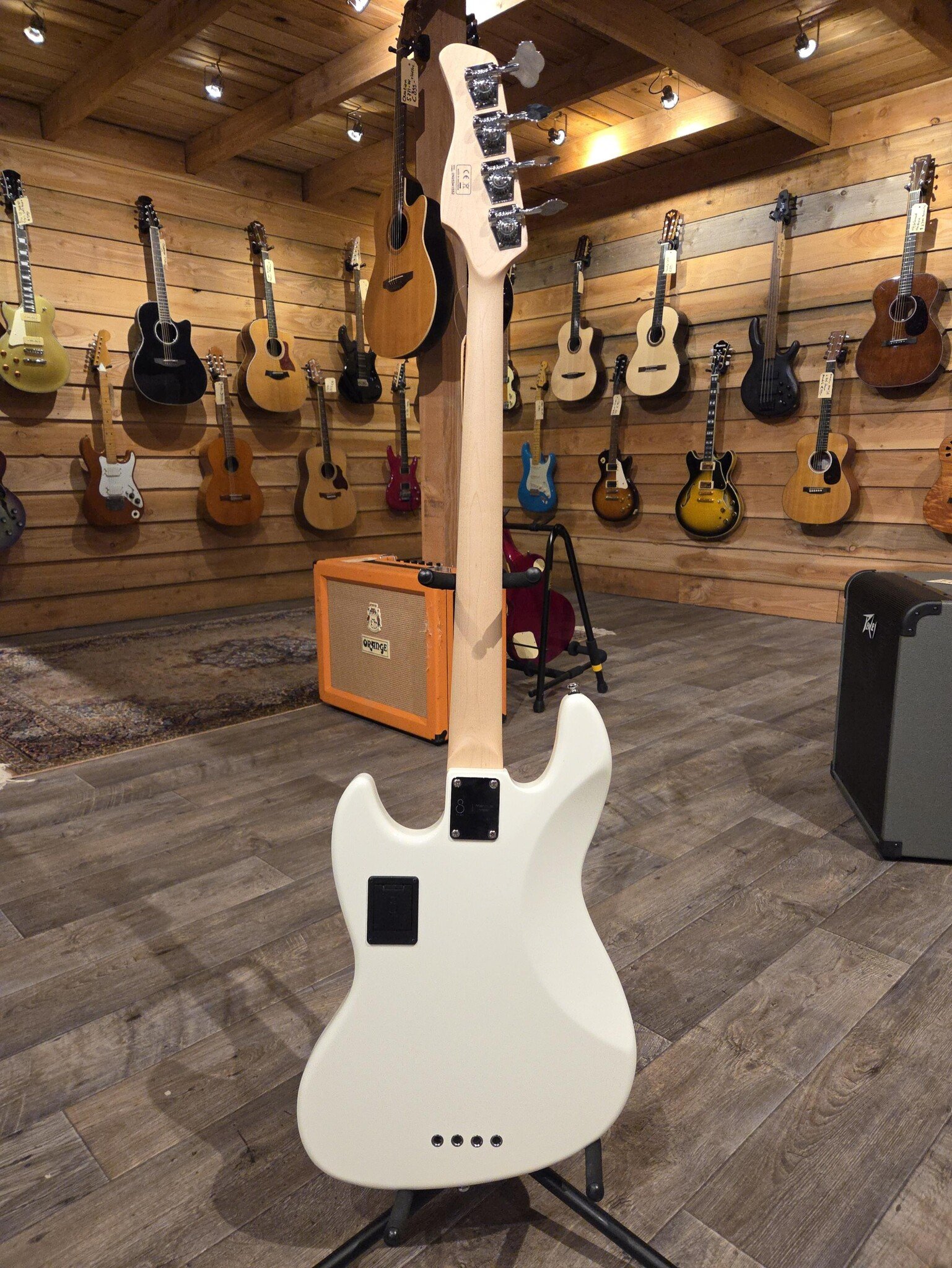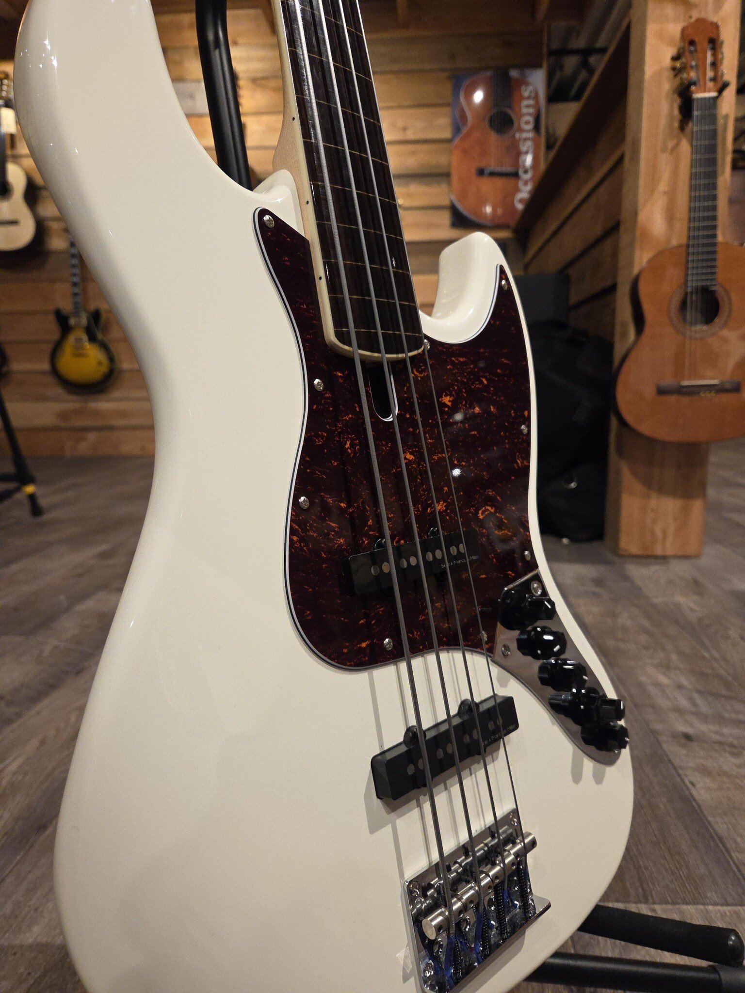 basgitaar, fretloos, 4-snarig, elzen, antique white