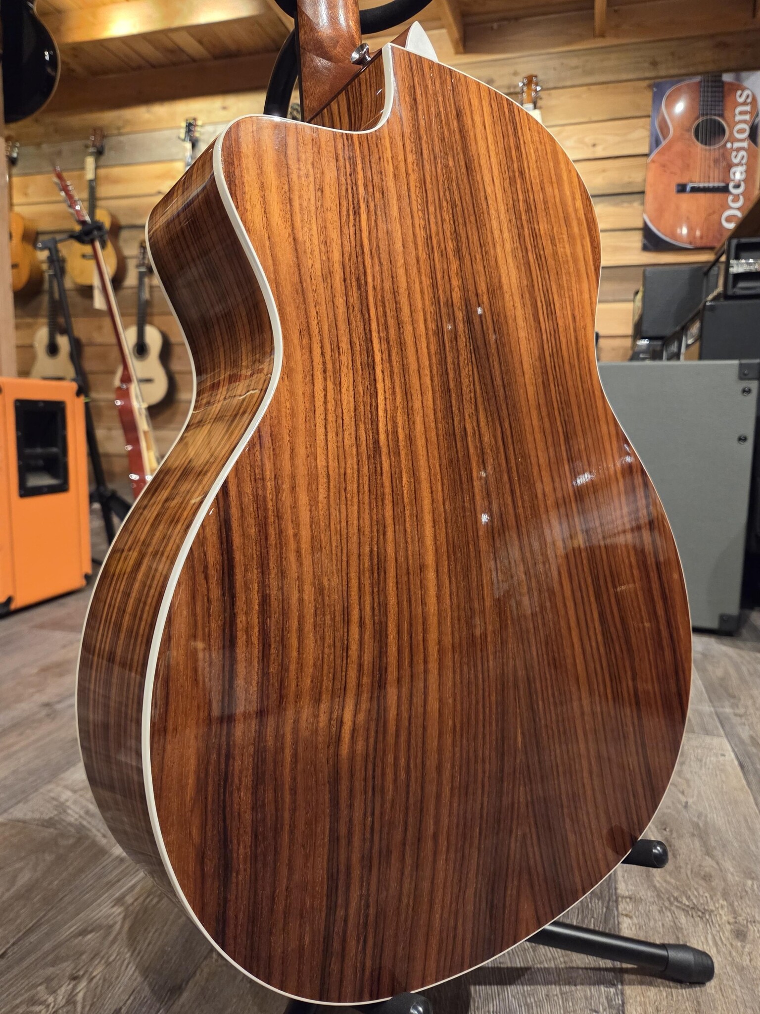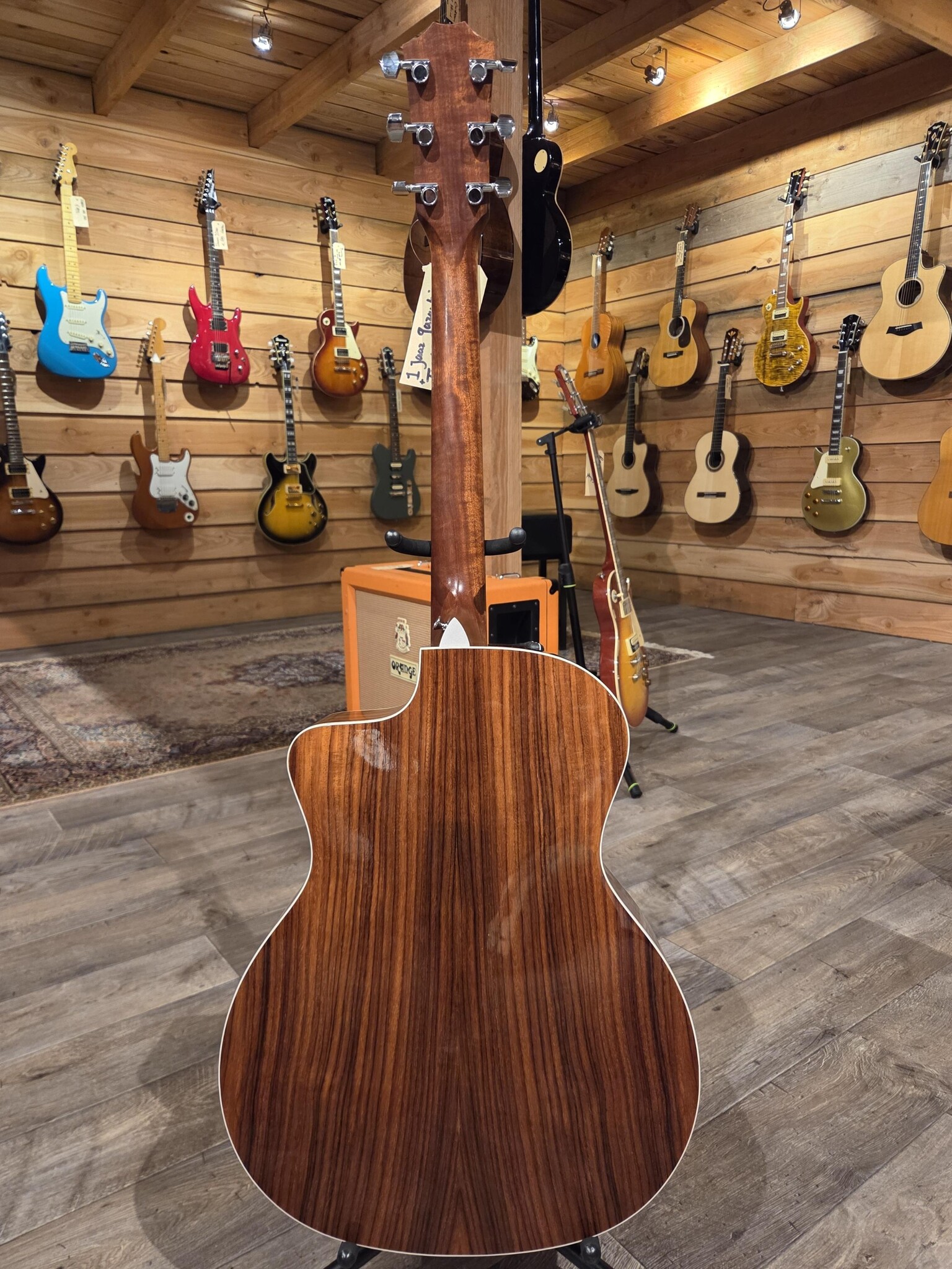 Grand Auditorium, een origineel ontwerp van Taylor, heeft bijgedragen aan de ontwikkeling van het akoestische Taylor-geluid. De populaire bodyvorm zorgt voor een veelzijdige gitaar die voldoende volume levert bij licht fingerpicking en reageert op medium strummen en flatpicking met een heldere, gebalanceerde klank over het hele toonbereik. Als je een geweldige allround gitaar zoekt, is de GA een uitstekende keuze.KlankhoutHet bovenblad van een gitaar is het belangrijkste filter en de belangrijkste verdeler van de vibrerende snaarenergie, wat betekent dat het een enorme invloed heeft op het geluid. Sitka-spar is het meest gebruikte hout voor gitaarbovenbladen in de moderne tijd. Het combineert stijfheid en elasticiteit in de juiste verhoudingen, wat resulteert in een breed dynamisch bereik met heldere articulatie. De gelaagde palissanderhouten achterkant en zijkanten vormen een stevig maar toch ontvankelijk platform voor de vibrerende snaarenergie die door het bovenblad van de gitaar wordt doorgegeven. Gelaagd hout is minder gevoelig voor temperatuur- en vochtigheidsveranderingen, waardoor het een uitstekende keuze is voor gitaristen die met hun instrument reizen of simpelweg meer duurzaamheid nodig hebben. ElektronicaTaylor's ES2 is een revolutionair pickup-ontwerp dat de nieuwste innovaties van Taylor op het gebied van akoestische gitaarversterking vertegenwoordigt. Het hart van het Expression System 2 is Taylor's gepatenteerde pickup achter de brug, die is voorzien van drie uniek geplaatste en individueel gekalibreerde pickup-sensoren. Doordat de pickup niet onder de brugzadel zit, maakt de onderkant van de brugzadel volledig contact met de brug. Hierdoor komen alle nuances van de gitaarklank helder door, zowel bij akoestisch als versterkt spelen. De plaatsing van de sensoren zorgt ervoor dat er een dynamischer bereik aan akoestisch geluid wordt vastgelegd dan ooit tevoren, ook bij versterkt spelen.In combinatie met Taylor's speciaal ontworpen voorversterker van professionele audiokwaliteit, produceert dit systeem een uitzonderlijke versterkte klank en respons. Op het podium via een PA-systeem, aangesloten op je favoriete akoestische versterker of rechtstreeks op opnamesoftware, geeft het Expression System 2 de klank van je Taylor-gitaar getrouw weer. Het Taylor Expression System 2 werkt op een eigen 9-volt batterijcompartiment en is voorzien van gebruiksvriendelijke volumeregelaars en actieve bas- en treble-regelaars.